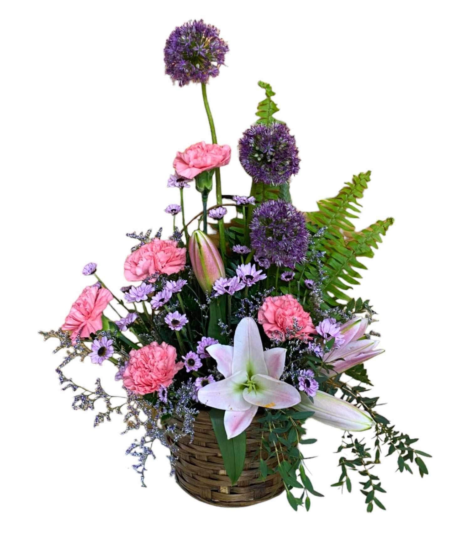 This stunning arrangement uses allium flowers, oriental lily, and carnations to really show off its whimsical magic.