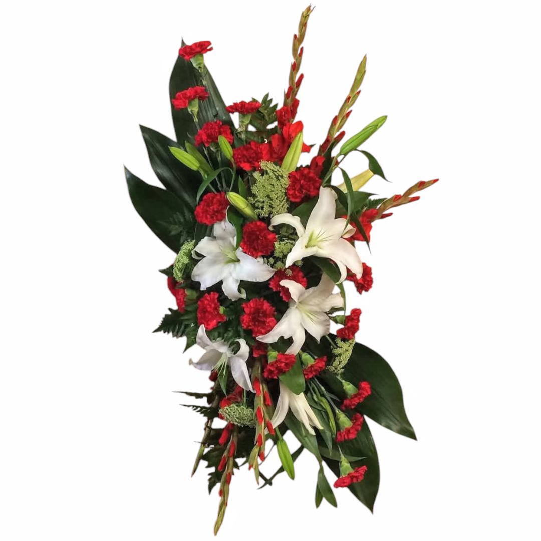 The Beyond the Horizon spray radiates grace with its harmonious blend of red and white blooms. Elegant white lilies symbolize purity and renewal, while vibrant red carnations convey deep love and admiration. Arranged with care, this standing spray embodies a touching farewell.