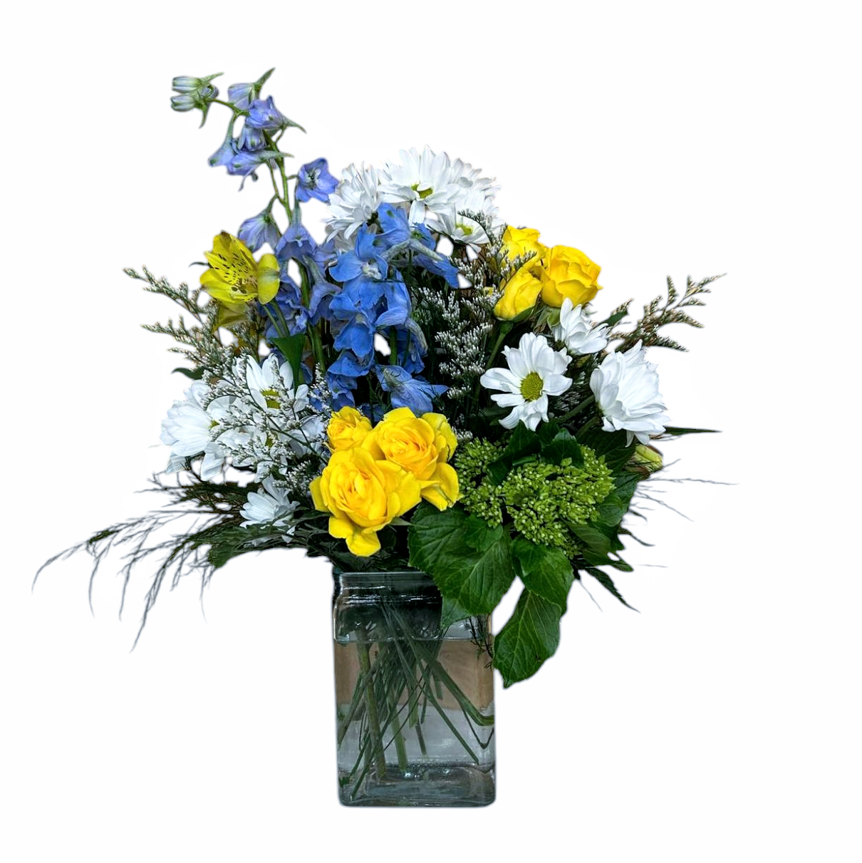 This beautiful tall vase arrangement features gorgeous sunny yellows, whites and blue flowers giving you the feeling of a bright blue sunny day.