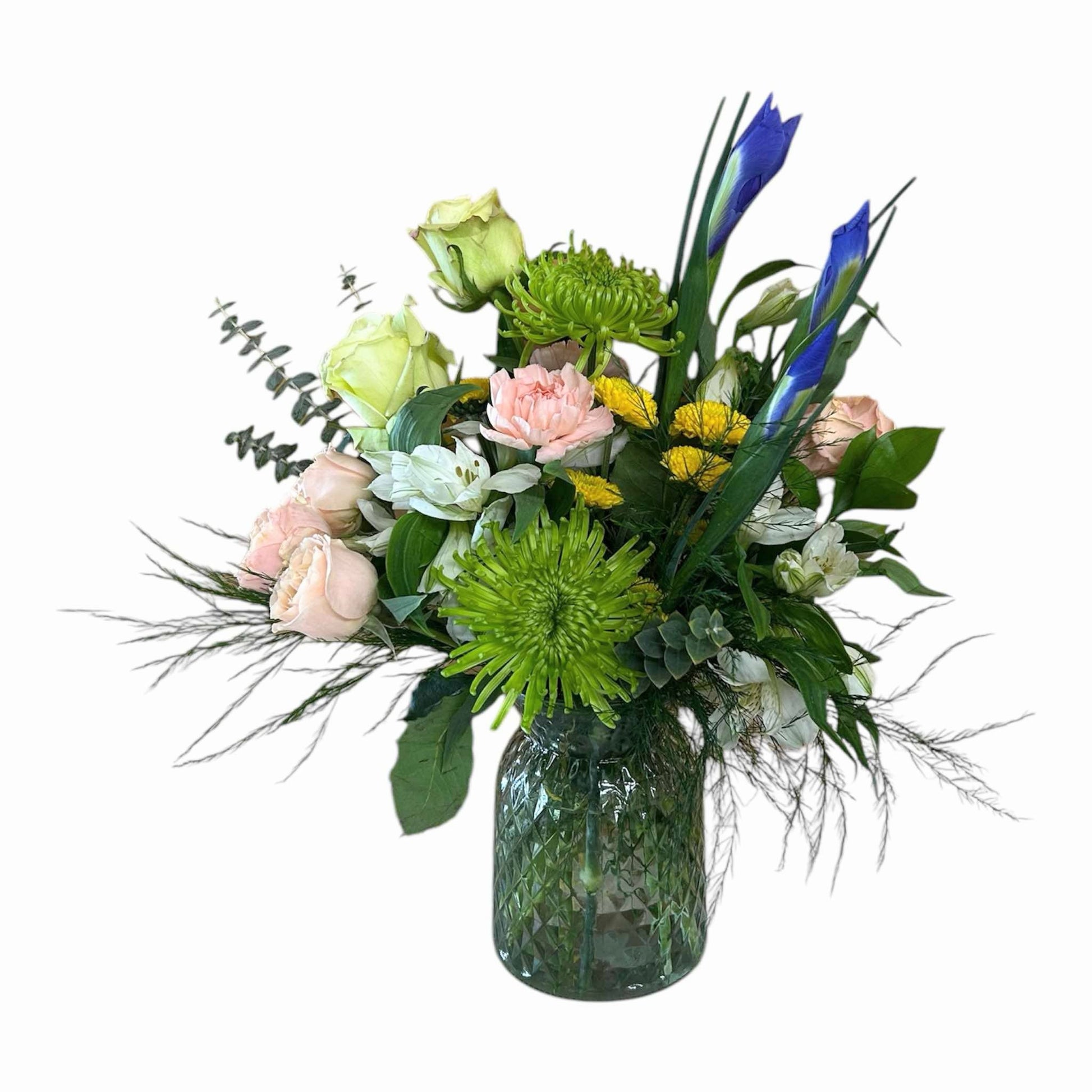 A beautiful spring arrangement featuring roses, carnations, irises, and daisies and more.