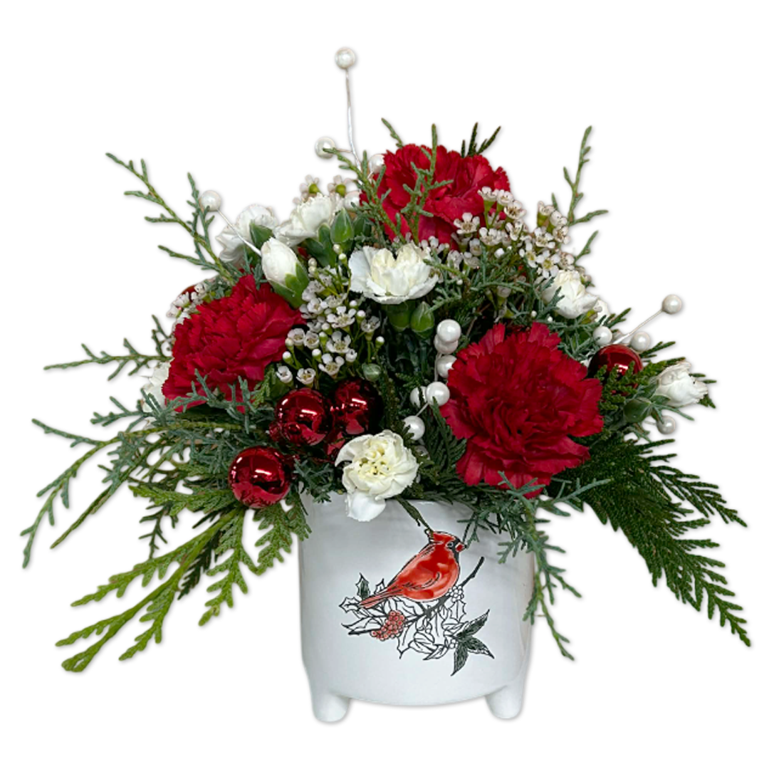 This holiday themed arrangement includes a beautiful ceramic container with festive Cardinal imagery, lovely greens, ornaments and a sprig of white berries! Upgrade the arrangement to include Carnations or Roses.