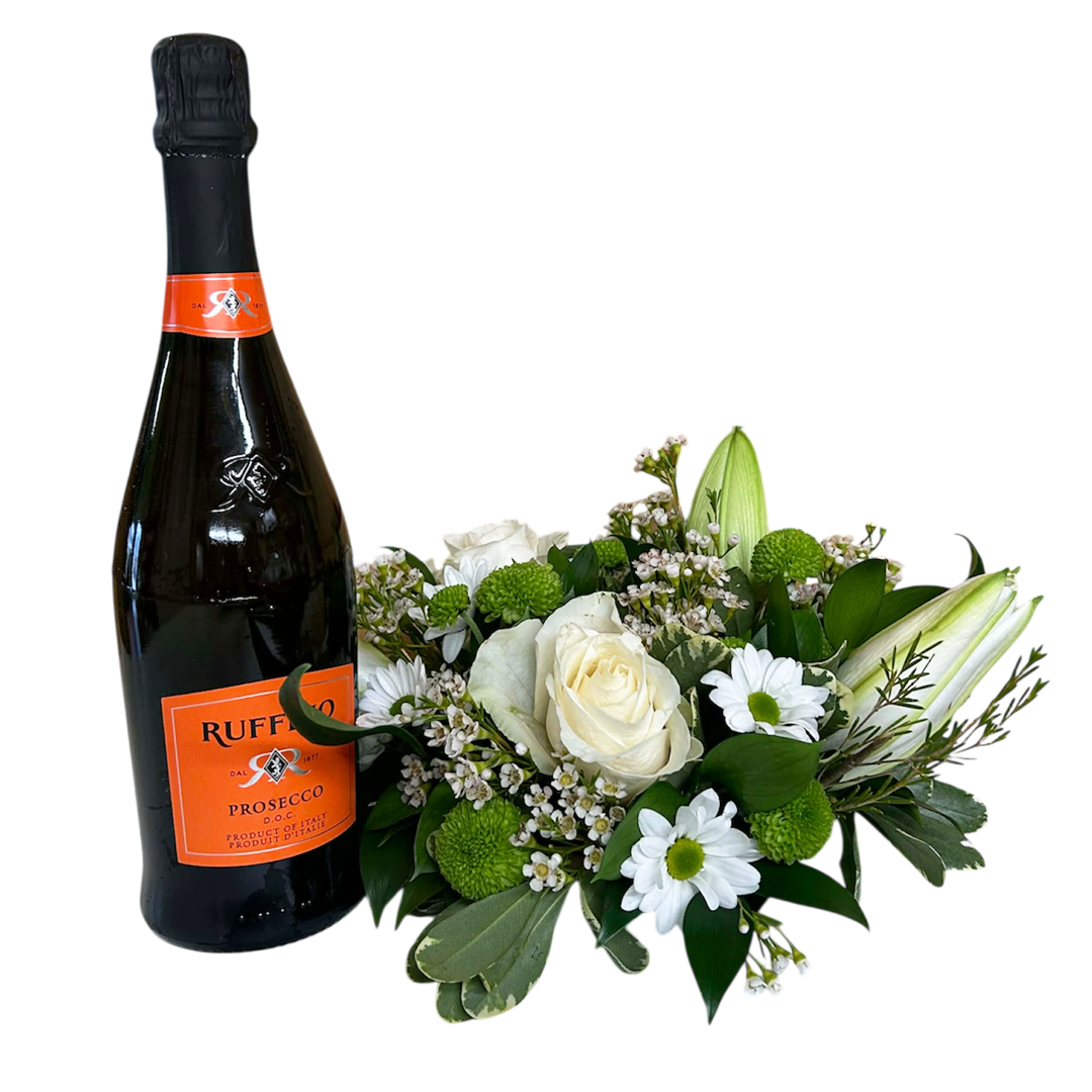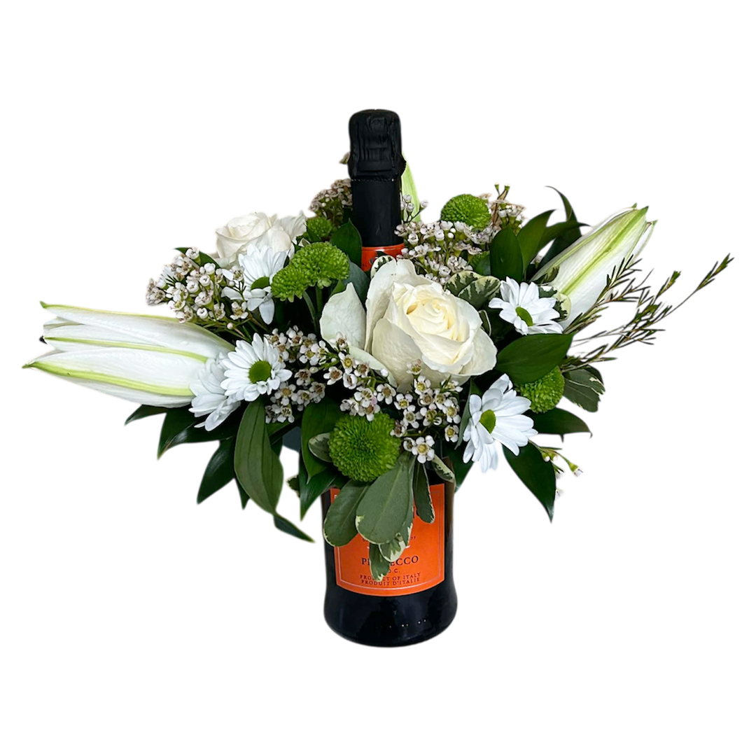 This holiday arrangement is a fun two-in-one gift! A beautiful fresh floral arrangement with roses, daisies and lilies- centered around our choice of champagne! Or bring your own bottle and we'll bring the bling!