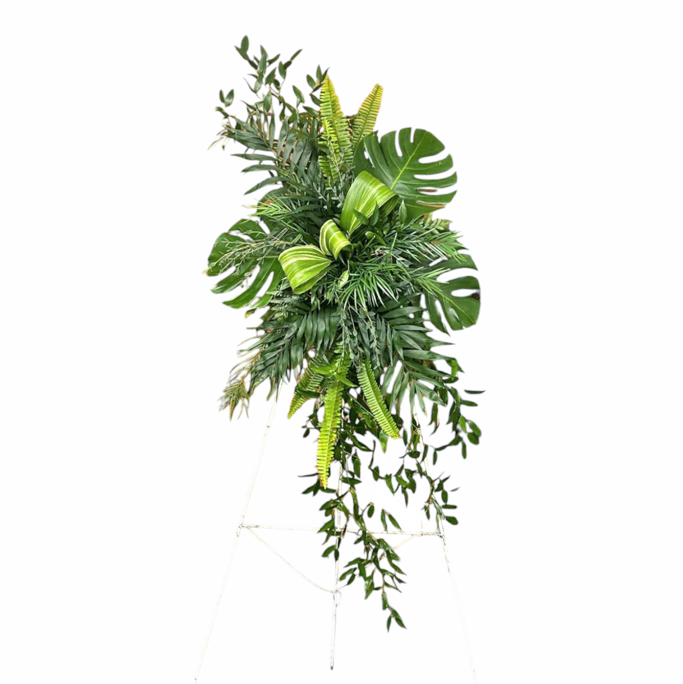 Eternal Fields is a soothing and timeless tribute, crafted entirely from lush green foliage and greenery. This serene standing spray features a harmonious blend of textures and tones, symbolizing renewal, peace, and everlasting memory.