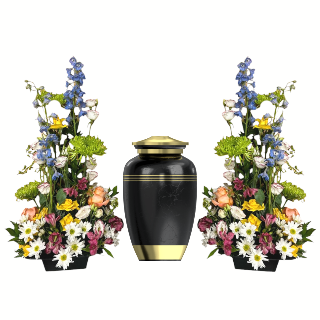 An elegant urn arrangement made by two matching pieces, creating a harmonious and balanced tribute. Flanking the urn, the two matching arrangements mirror the colors and floral elements, bringing symmetry and unity to the display. Together they create a cohesive and visually striking tribute, symbolizing the eternal connection between memories, love, and peace.