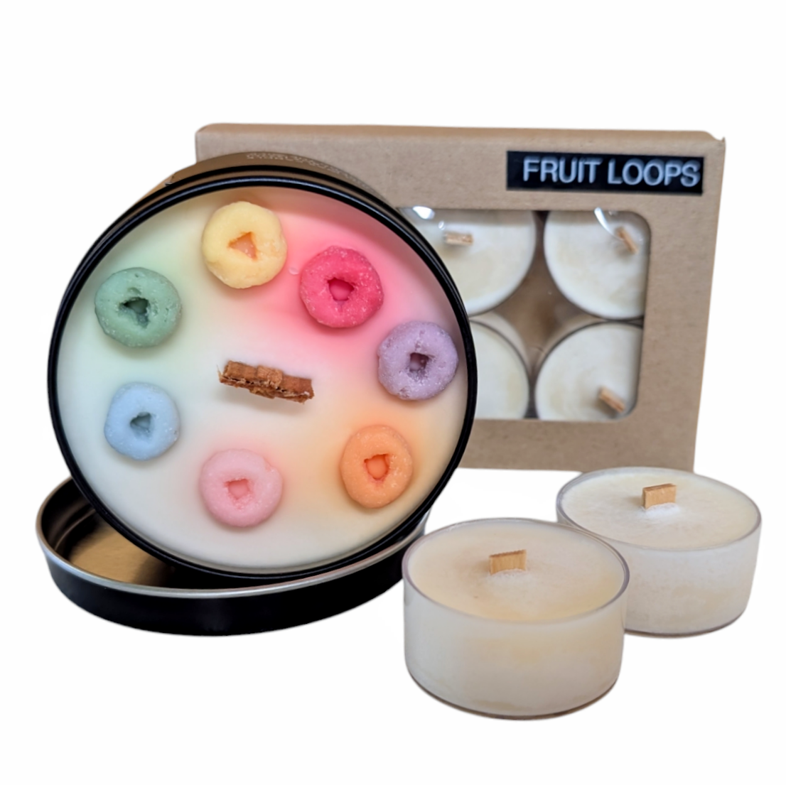 A taste of everyone’s favourite cereal, this fruit loops scented soy wax available as a 8oz hand poured candle, or package of 6 tea lights.