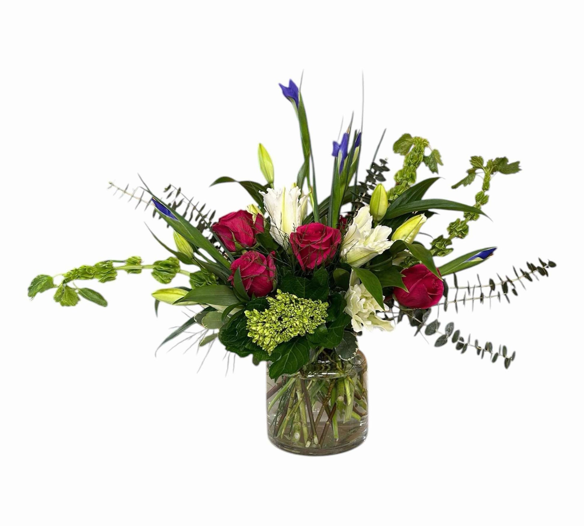 A luxurious and fresh garden themed arrangement featuring premium flowers such as roses, hydrangea, lily, iris and more.