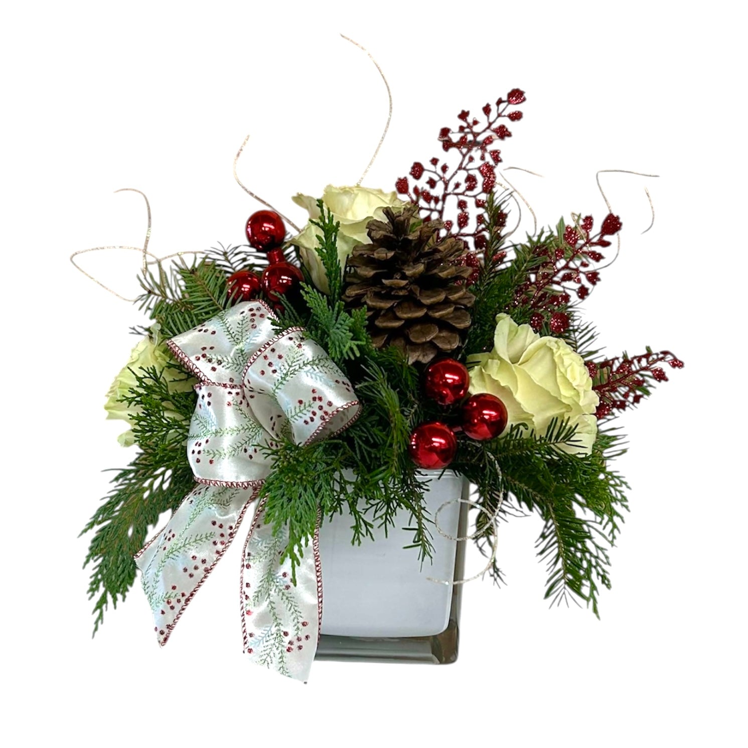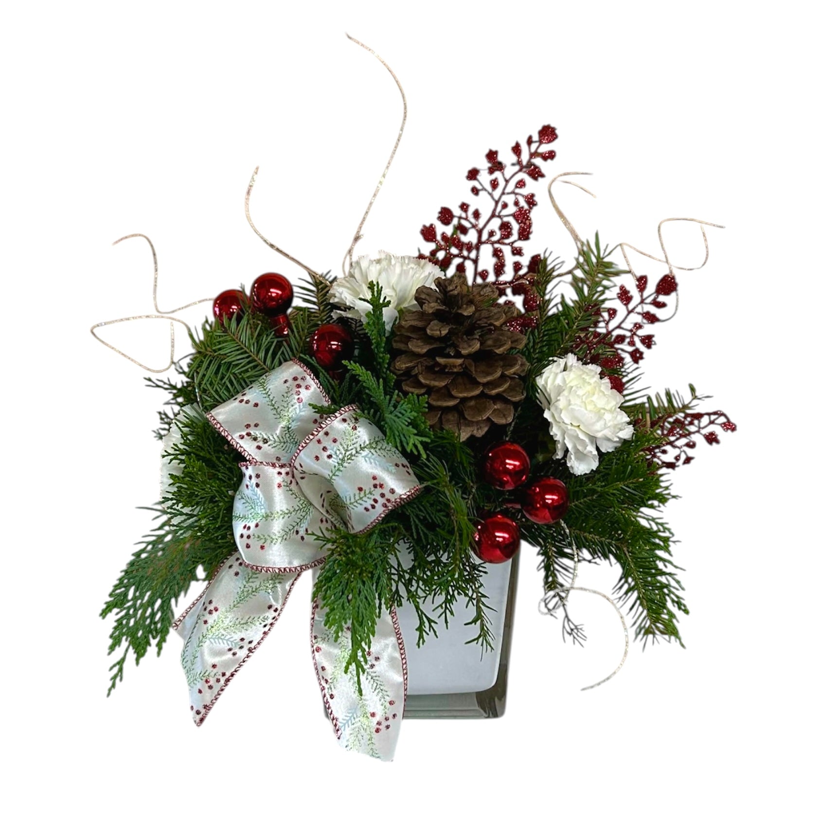 This holiday themed arrangement features a beautiful holiday bow, pinecones, holly and more and is available to upgrade with carnations or roses.