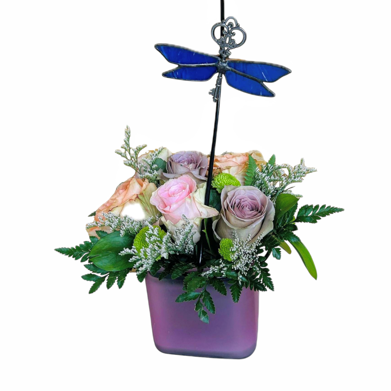 Featuring beautiful roses, mum's and caspia, and topped with a special Butterfly or Dragonfly stained glass charm made by Debs Broken Glass.