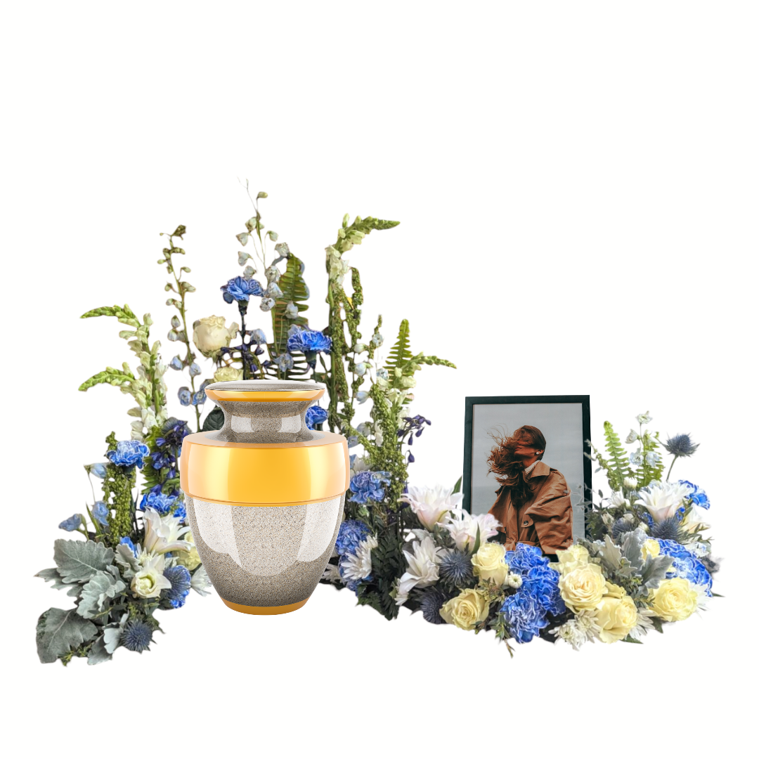 The meaningful urn arrangement is designed so that there are line flowers in the back of the arrangement presenting the urn and lower flowers around the front so that any design on the urn is visible. The fresh flowers to note in this arrangement are: snapdragons, roses, with both button and spider mums. This arrangement is also available in separate color combinations.