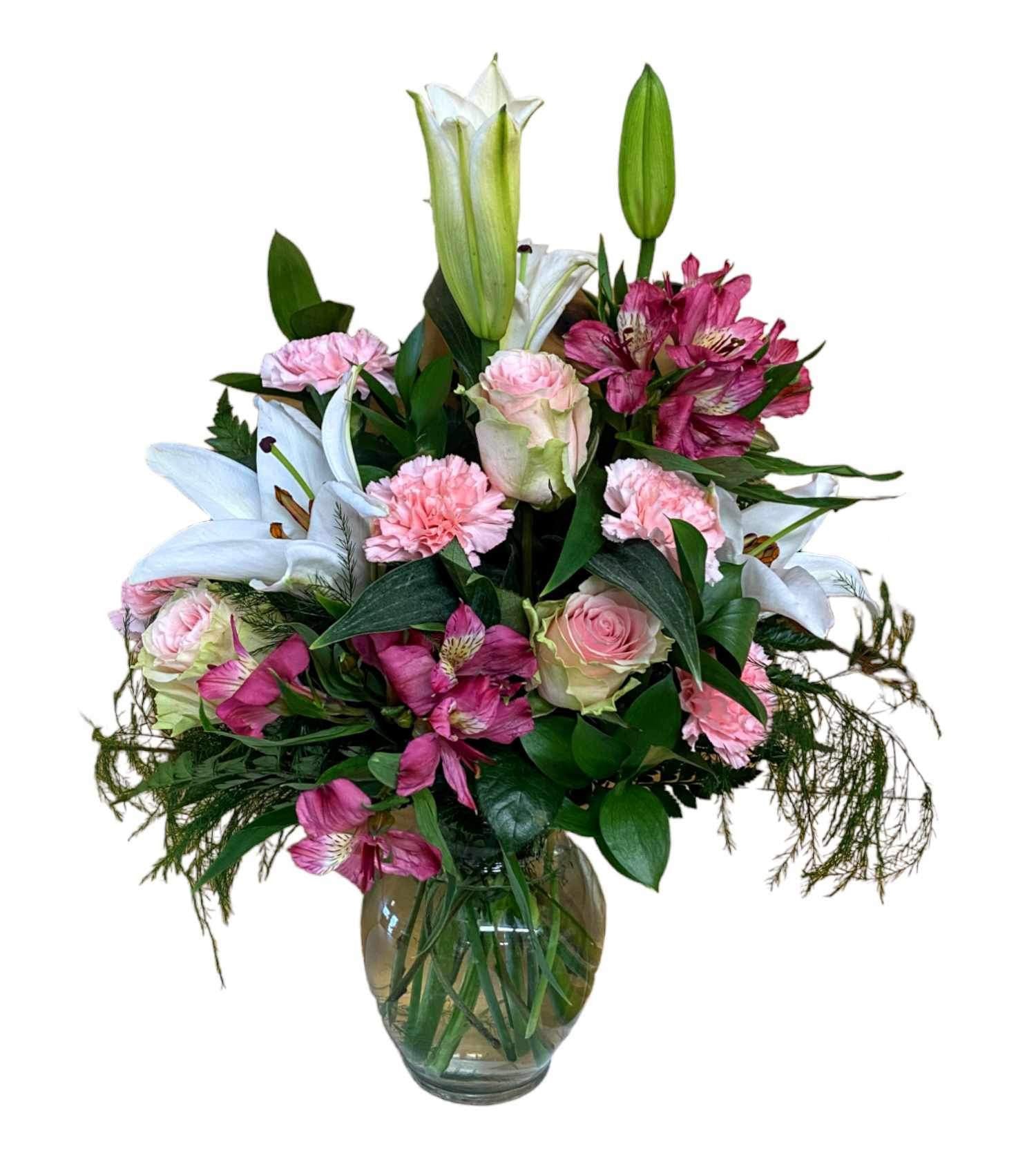 This beautiful tall vase arrangement features the oriental lily, carnations and alstroemeria flowers, as well as gorgeous greenery to really show off.