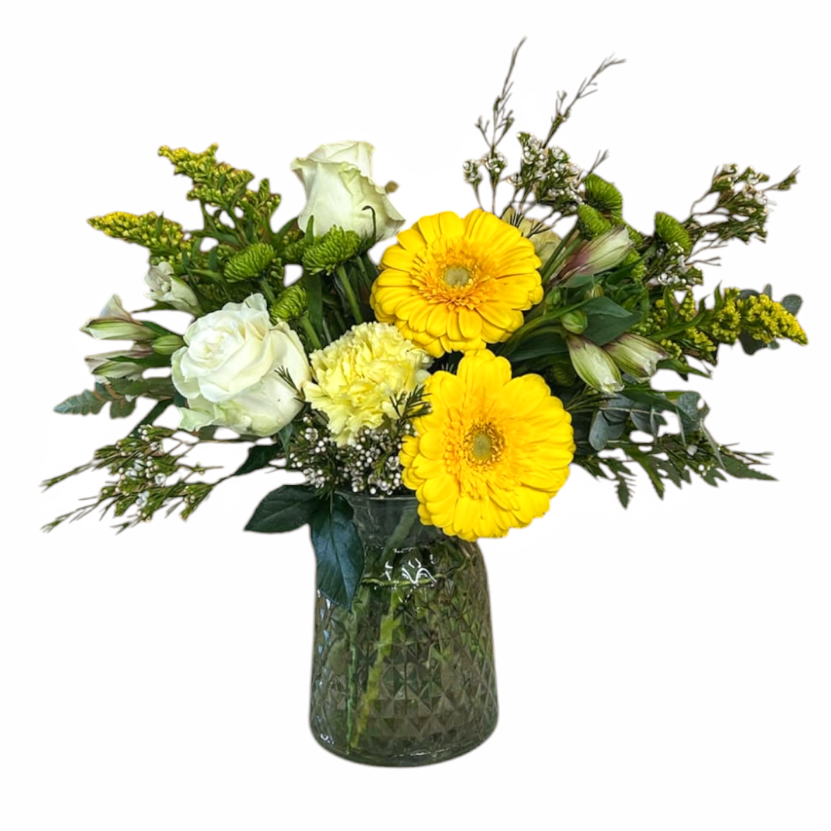 This sunny and bright arrangement features white roses, carnations, button mums, and of course the bright yellow gerbera daisies.